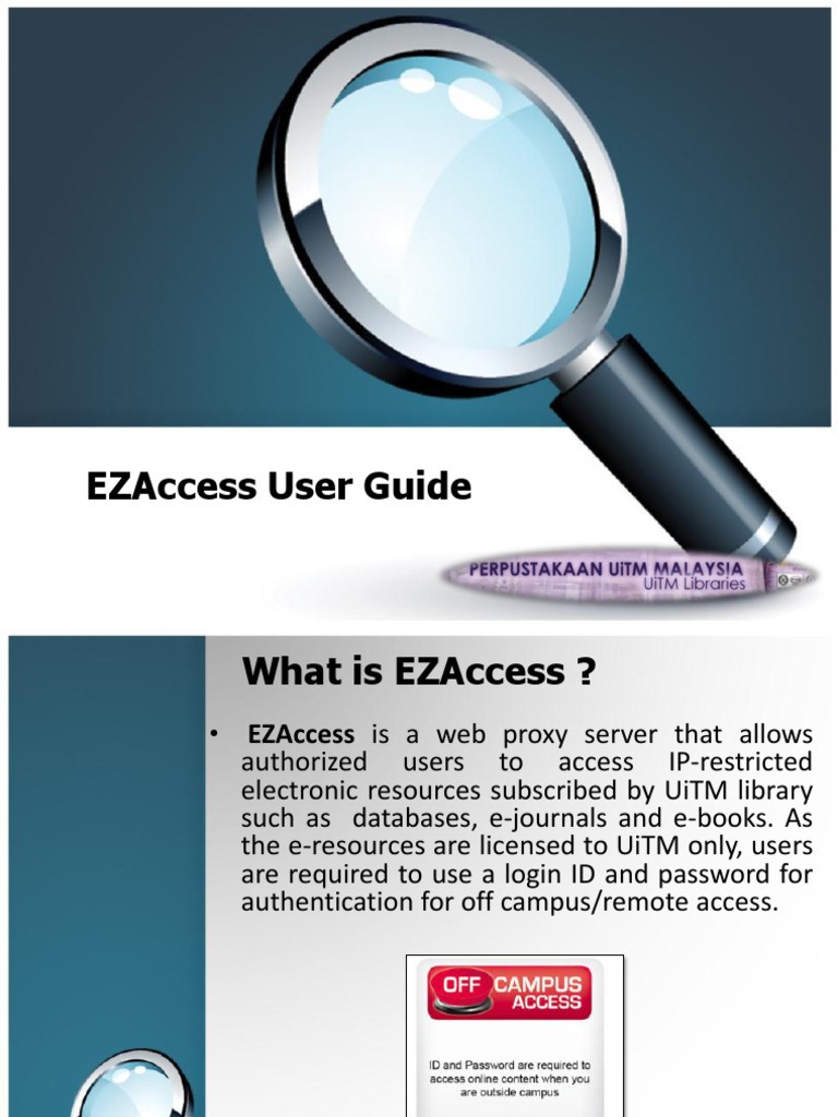 Ezaccess User Guide Ezaccess Is A Web Proxy Server That Allows Authorized Users To Access Ip Restricted Electronic Resources Subscribed By Uitm Library Ppt Download